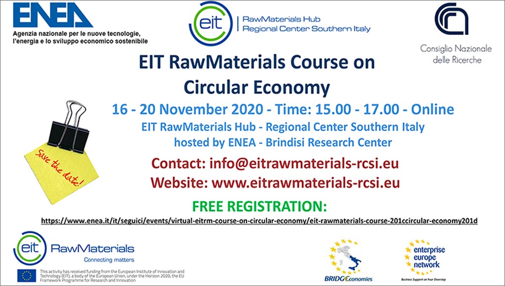 The EIT RawMaterials Hub - Regional Center Southern Italy (RCSI), hosted by ENEA Research Center in Brindisi (Italy) has planned an open daily Virtual Raw Materials Course (time: 15-17, CEST - each day) devoted to Circular Economy and Closing Material Loops. It will take place in remote mode using a ZOOM platform.