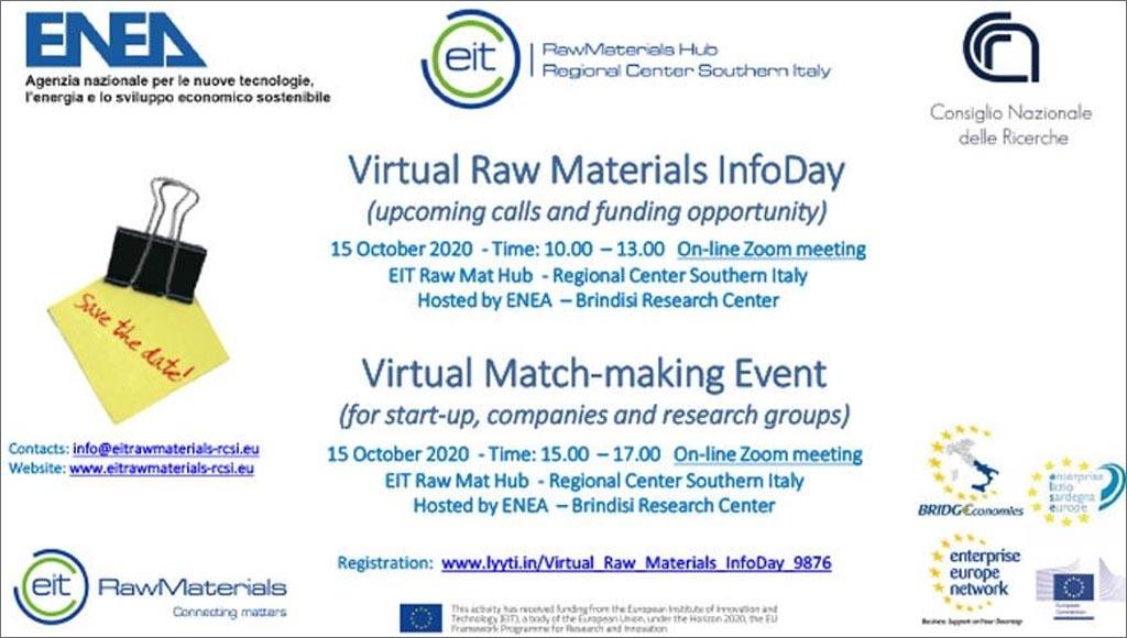 The EIT RawMaterials Hub - Regional Center Southern Italy (RCSI), hosted by ENEA Research Center in Brindisi (Italy) has planned an open Virtual Raw Materials InfoDay (time: 10-13, CEST) and an open Virtual Matchmaking Meeting (time: 15-17, CEST), that will take place in remote mode using a ZOOM platform.